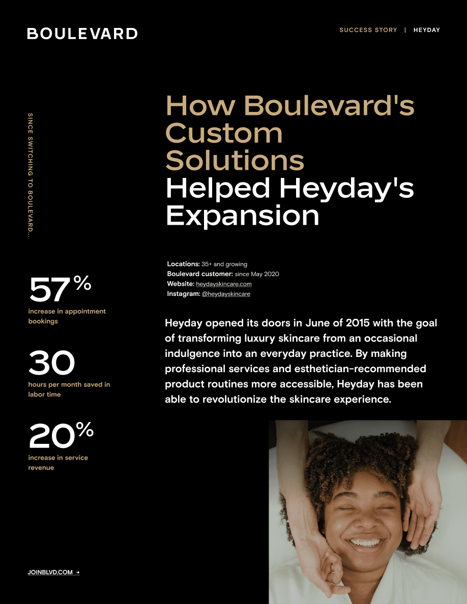 Heyday opened its doors in June of 2015 with the goal of making luxury skincare an everyday practice. However, when it came to their business management platform, owner Michael Pollak was left wanting. Soon he made the switch to Boulevard to streamline operations and increased service revenue by 20% in the process. Read the full case study to see how it happened.