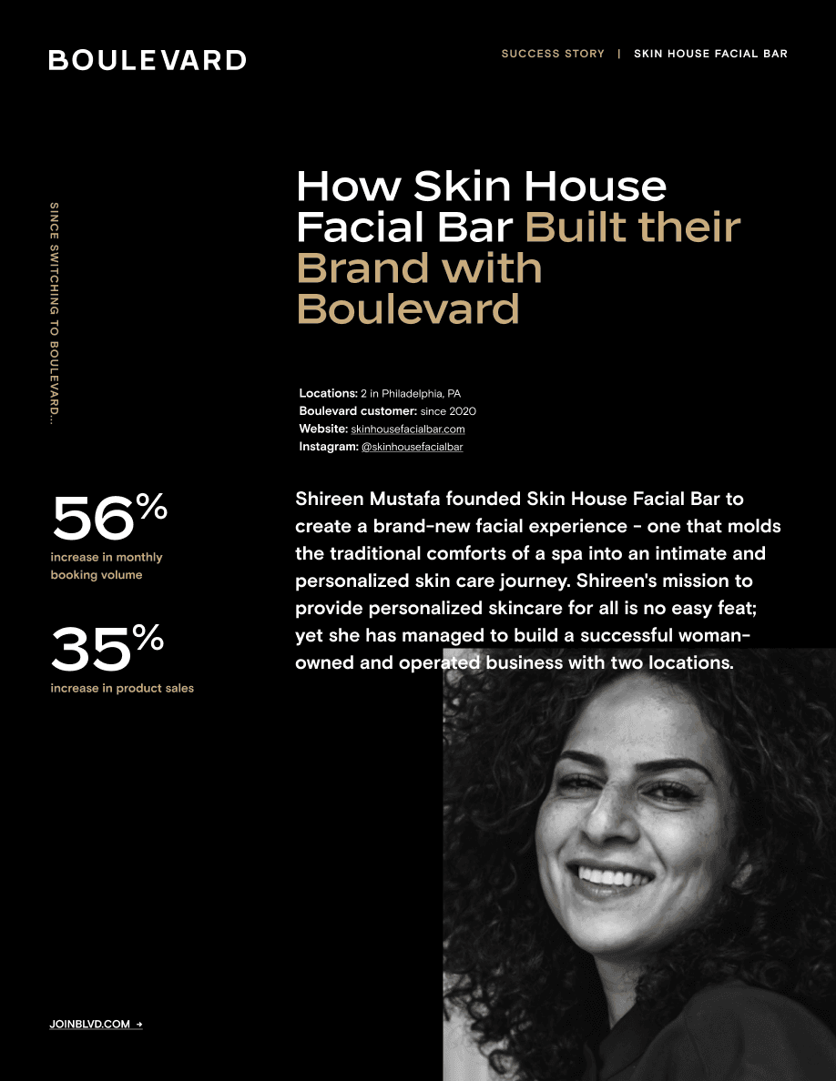 After struggling with Booker’s inability to offer her staff and clients the support they needed, Shireen found Boulevard — a business management platform designed specifically for beauty service brands. Developed along with industry leaders in the salon space, Boulevard proved to be the perfect solution in allowing Skin House Facial Bar to easily offer better booking, more personalized care, and it provided the tools she needed to manage and grow her empire.
