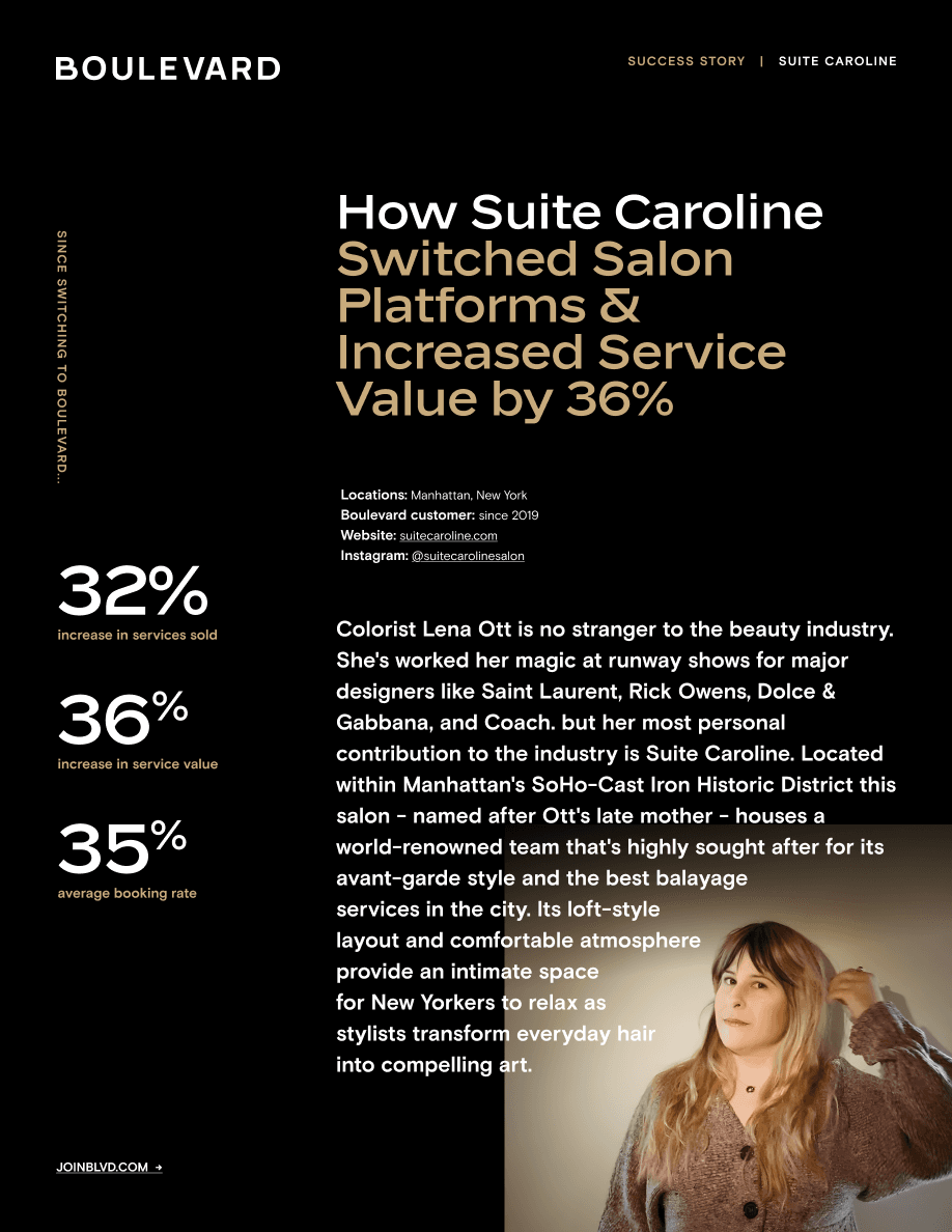 Colorist Lena Ott is a beauty industry veteran, with her fabulous work shining bright on the runway for designers like Dolce & Gabbana and Coach. So when it came to her single-location salon, Suite Caroline, it's no surprise Ott didn't want to settle for just any salon software solution. Boulevard helped Suite Caroline achieve a 32% increase in services sold, a 36% increase in service value, and a 35% average booking rate. Read how in this case study!