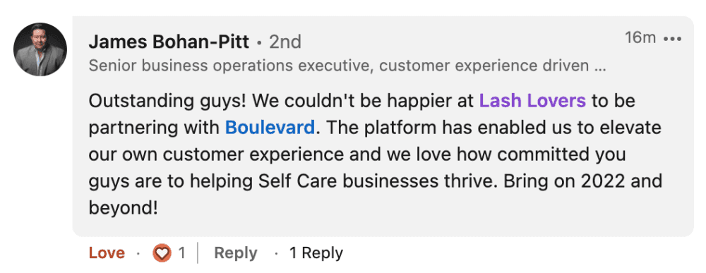 Outstanding guys! We couldn't be happier at Lash Lovers to be partnering with Boulevard. The platform has enabled us to elevate our own customer experience and we love how committed you guys are to helping Self Care businesses thrive. Bring on 2022 and beyond!